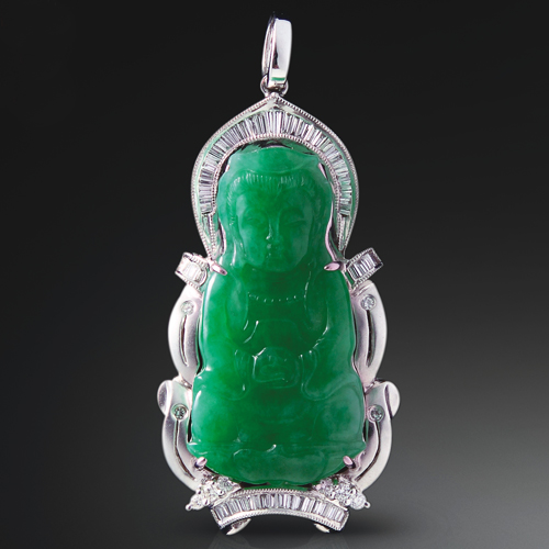 玉料滿色晶瑩,翠色欲滴,金鉆鑲玉,高雅尊貴。