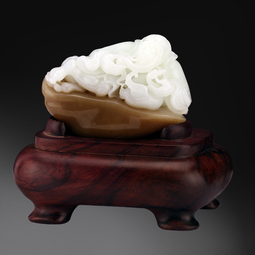 顏色潔白,質地細膩,油潤度極佳,手感溫潤順滑。王羲之是晉代書法家,從家鵝游水中悟出用筆之法,于是養成愛鵝之癖。作品中王羲之閑適而臥,撫須出神,若有所思,白鵝展翅望向王羲之,動靜皆宜,惟妙惟肖。